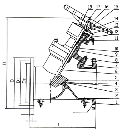 结构图中数字解释:1表示铜接头,2表示阀体,3表示焊堆,4表示阀瓣密封垫,5表示阀瓣,6表示阀杆螺母,7表示双头螺栓,8表示六角螺母,9表示支架,10表示阀杆,11表示填料,12表示调节锁紧总成,13表示填料压盖,14表示定位齿轮,15表示壳罩,16表示手轮,17表示六角螺母,18表示指示盘。