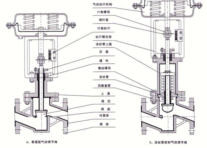 执行机构是气动调节阀生产过程自动控制系统的重要组成部分,其有正反两种作用形式,当信号压力增加,推杆伸出膜室的叫正作用,与阀配合构成气关式(如图2a)。当信号压力增加,推杆推出膜室的叫反作用,与阀配合构成气开式(如图2b)。其原理:当信号压力输入膜室后,在膜片上产生推力,压缩弹簧,使推杆移动,带动阀杆,改变阀芯与阀座之间的流通面积,知道弹簧的反作用与信号压力作用在膜片上的推力想平衡,从而达到自动调节工艺参数之目的。