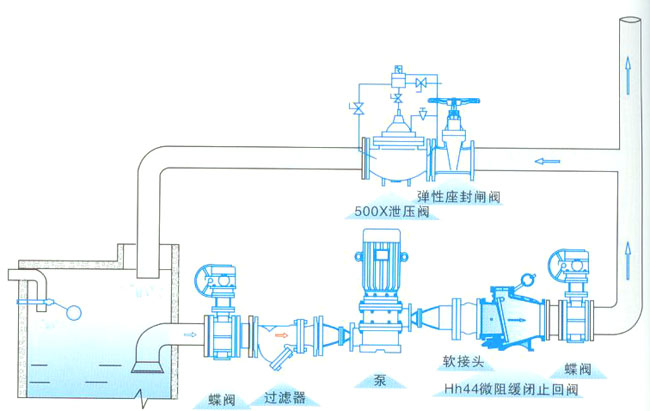该阀由阀体、阀盖、阀瓣、阀轴及调节阀等组成,安装在水泵出口处用来防止介质逆流和消除破坏性水锤,并能有效地减少阀门关闭的水锤压力,可保障管网安全运行。它具有阀瓣轻、开度大、节电效果显著,流体阻力小,水锤消除机构设计新颖,密封性能稳定可靠、耐磨损、使用寿命长、运行平稳、无震动、无噪音等特点。